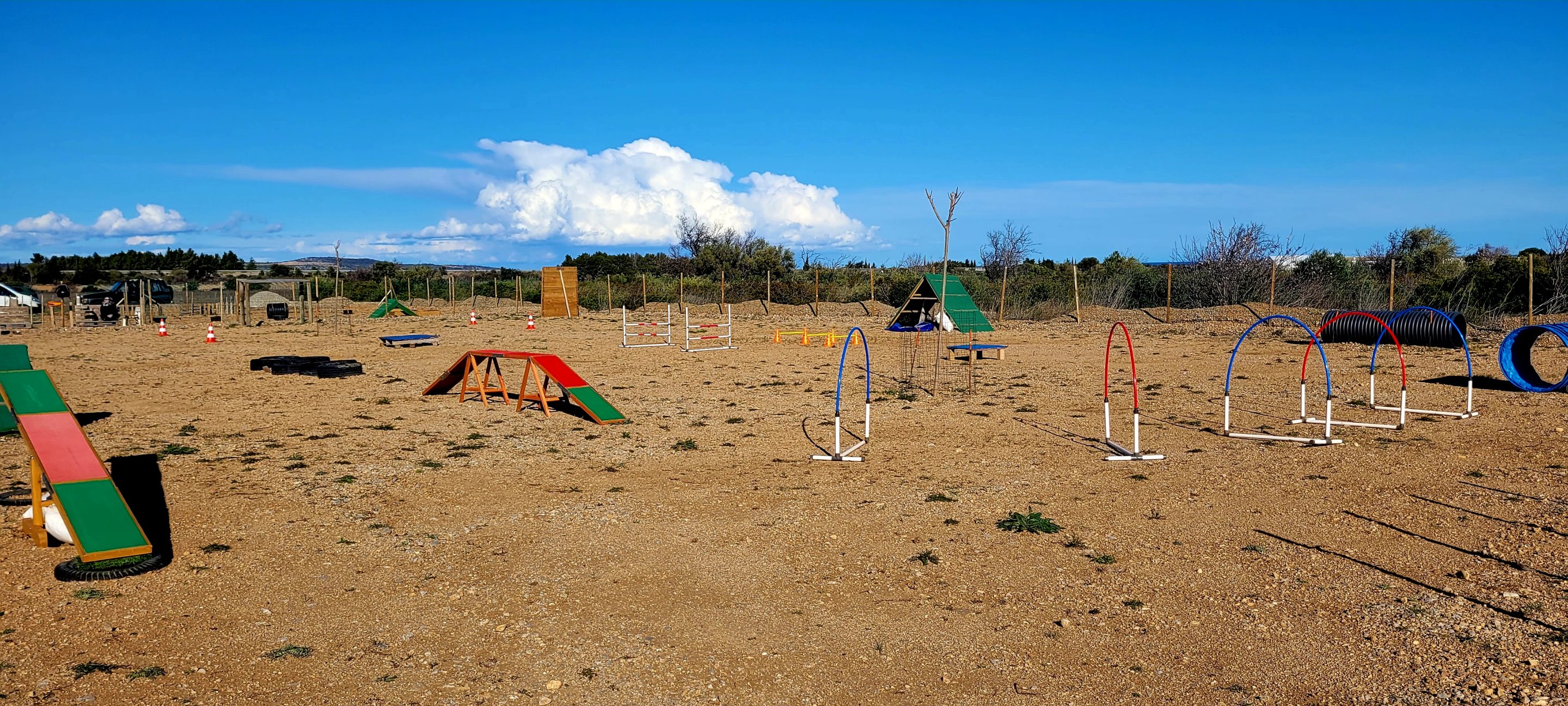 Venez découvrir notre terrain de cours collectifs canins, un espace sécurisé et spécialement aménagé pour l’éducation positive.